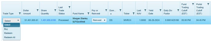 To enter a trade, click on the Select button for that fund and choose Buy, Redeem or Redeem All