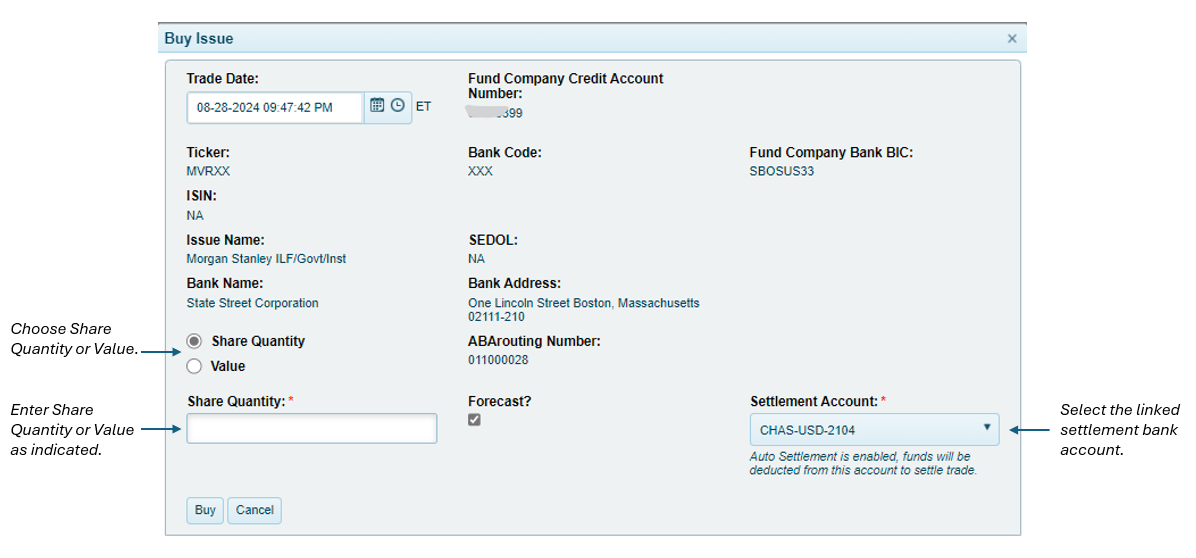 Enter the required trade type, the trade amount and ensure the correct linked deposit settlement account is selected. Press "Buy" (or Redeem, etc.) to enter your trade.