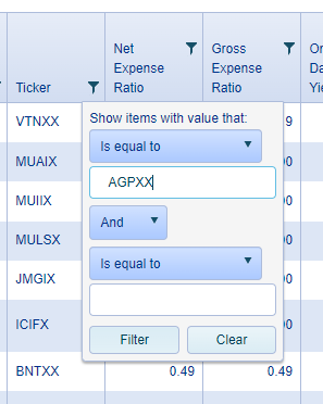 Users can filter funds on any of the grid columns, including Fund Asset Manager, and Minor Category (Investment Objective).